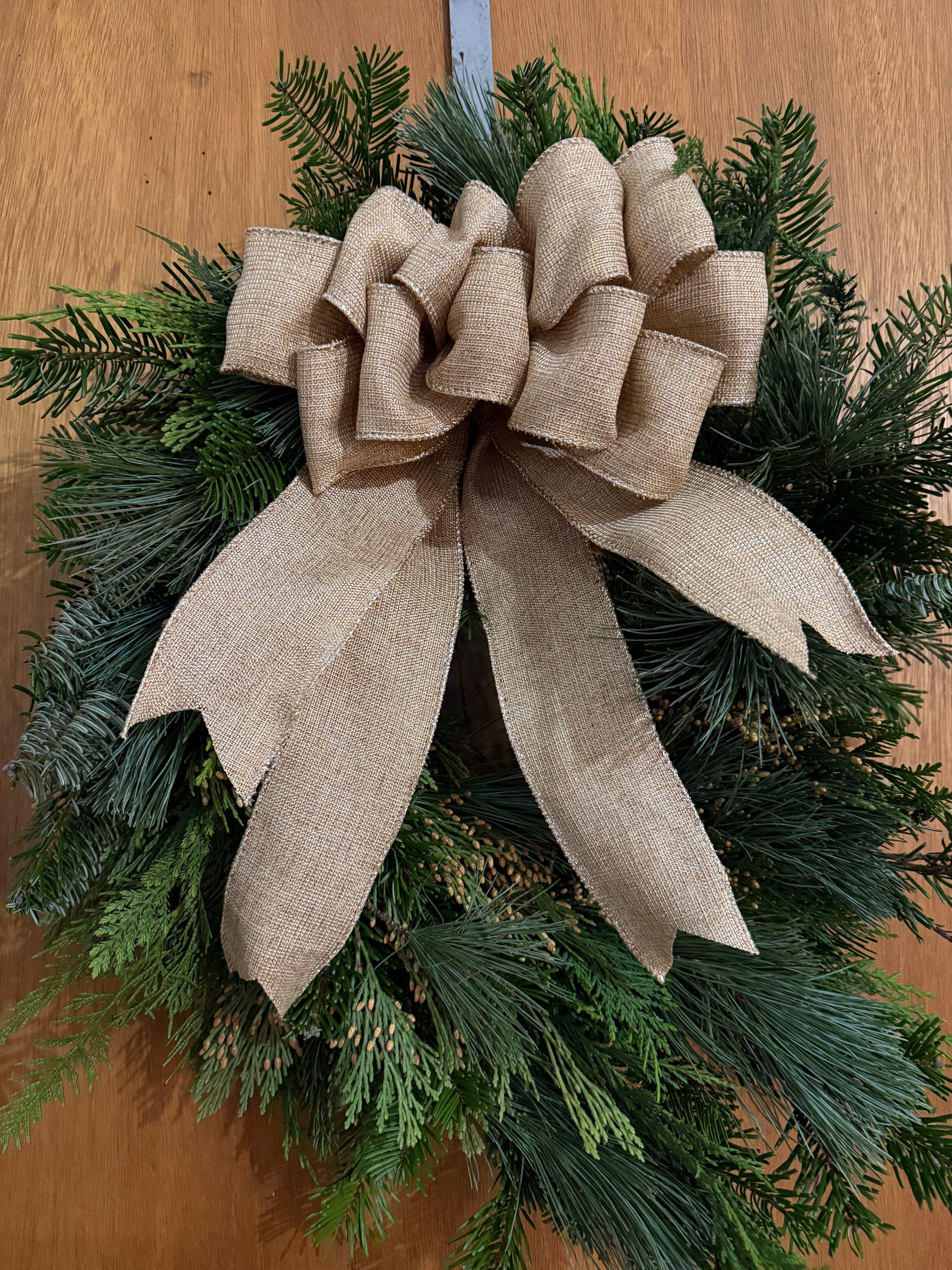 Each wreath is handcrafted with a lush mix of noble fir, silver fir, pine, incense cedar and traditional cedar. 20-24 inches